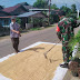 Kali Sertu Slamet Budi membantu bapak Muhammad menjemur padi di depan halaman rumah.
